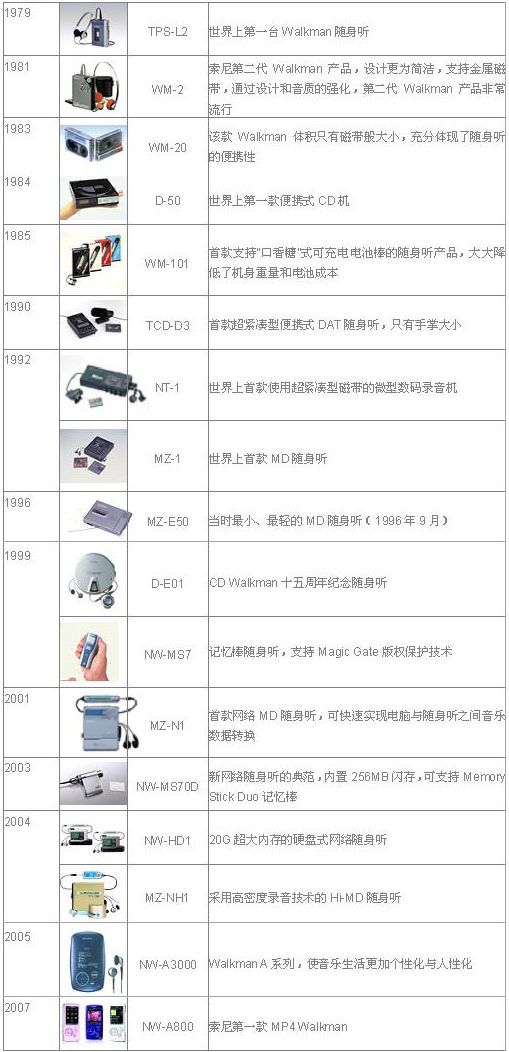 在索尼发明“Walkman” 之后的28年以来,索尼的个人音频产品经历了多个发展阶段,诞生了众多经典产品和技术;1982年,Sony开发出世界第一台CD唱机,1984年,Sony又推出了便携激光唱盘机Discman,它的出现使人们自由地享受更高质量的音乐成为可能;1992年,Sony再次开发出能以数码方式进行录音的MiniDisc(MD);1999年,Sony发布Walkman 20周年纪念版CD随身听D-EJ01,搭载了世界首创永无跳音的G-Protection避震系统;2001年12月,世界首台Net MD-MZ-N1发售;2005年,Hi-MD诞生;2006年,代表索尼数码音播放器最高音质水准的S700F/S600系列以及运动型数码音乐播放器S200系列发布;而2007年,NW-A800系列、PMX-M70系列和PMX-U50系列的发布宣告索尼正式进入便携数码视频市场(详细内容参见后附表格)。