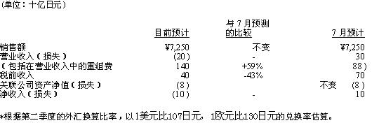 然而,由于今天宣布的作为索尼集团中期战略一部分的重组策略新增加的部分,营业收入(损失)向下调整了500亿日元。如不包括重组费用,和7月28日的预报在本质上是没有变化的。有关更多的重组信息请参考今日发布的“索尼集团中期公司战略(05财年至07财年)”。